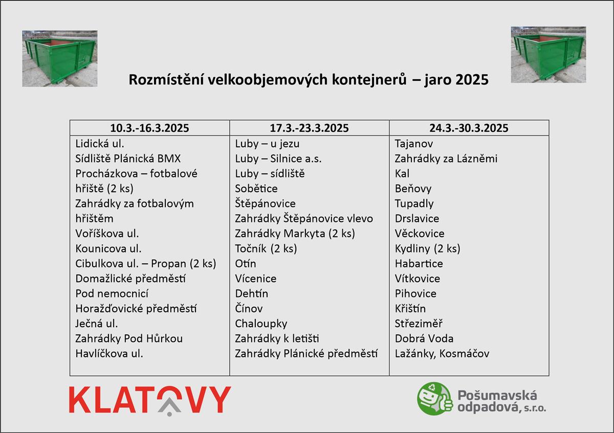 Město Klatovy informuje občany o rozmístění velkoobjemových kontejnerů (VOK) v období od 10. 3. do 30. 3. 2025 na vybraných stanovištích v Klatovech i integrovaných obcích. 📅