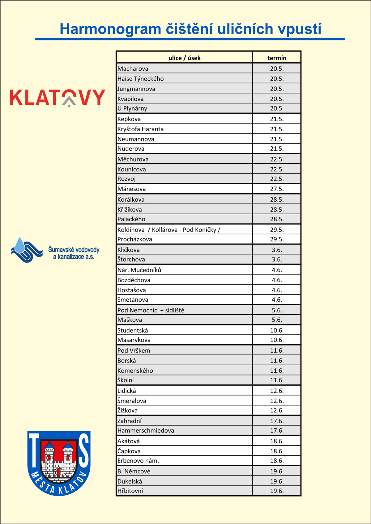 Technické služby Klatovy ve spolupráci se společností Šumavské vodovody a kanalizace a.s. jako každý rok provádějí průběžnou údržbu a čištění kanalizačních vpustí. 🛠️💧