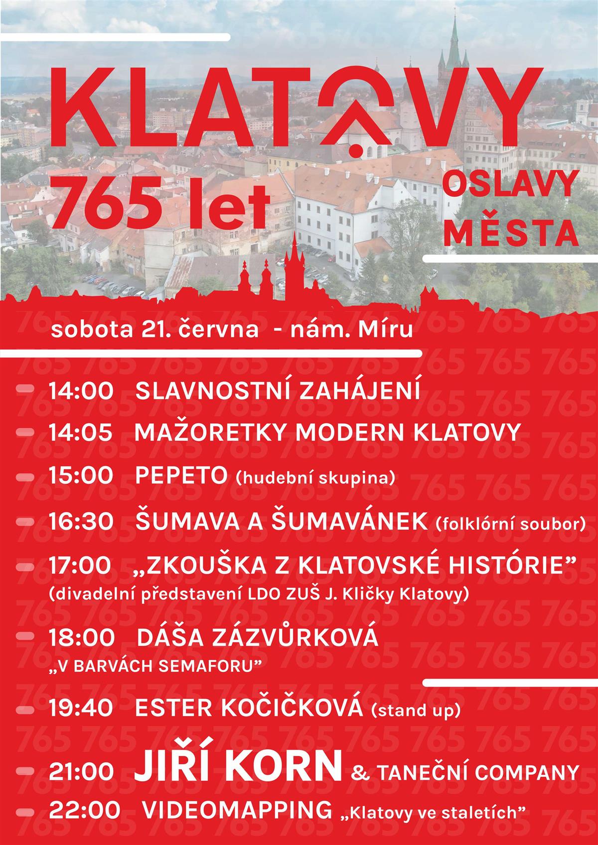 Srdečně vás zveme na celodenní slavnost u příležitosti 765. výročí založení města! Přijďte si užít pestrý program plný hudby, tance, divadla i zábavy pro všechny generace.