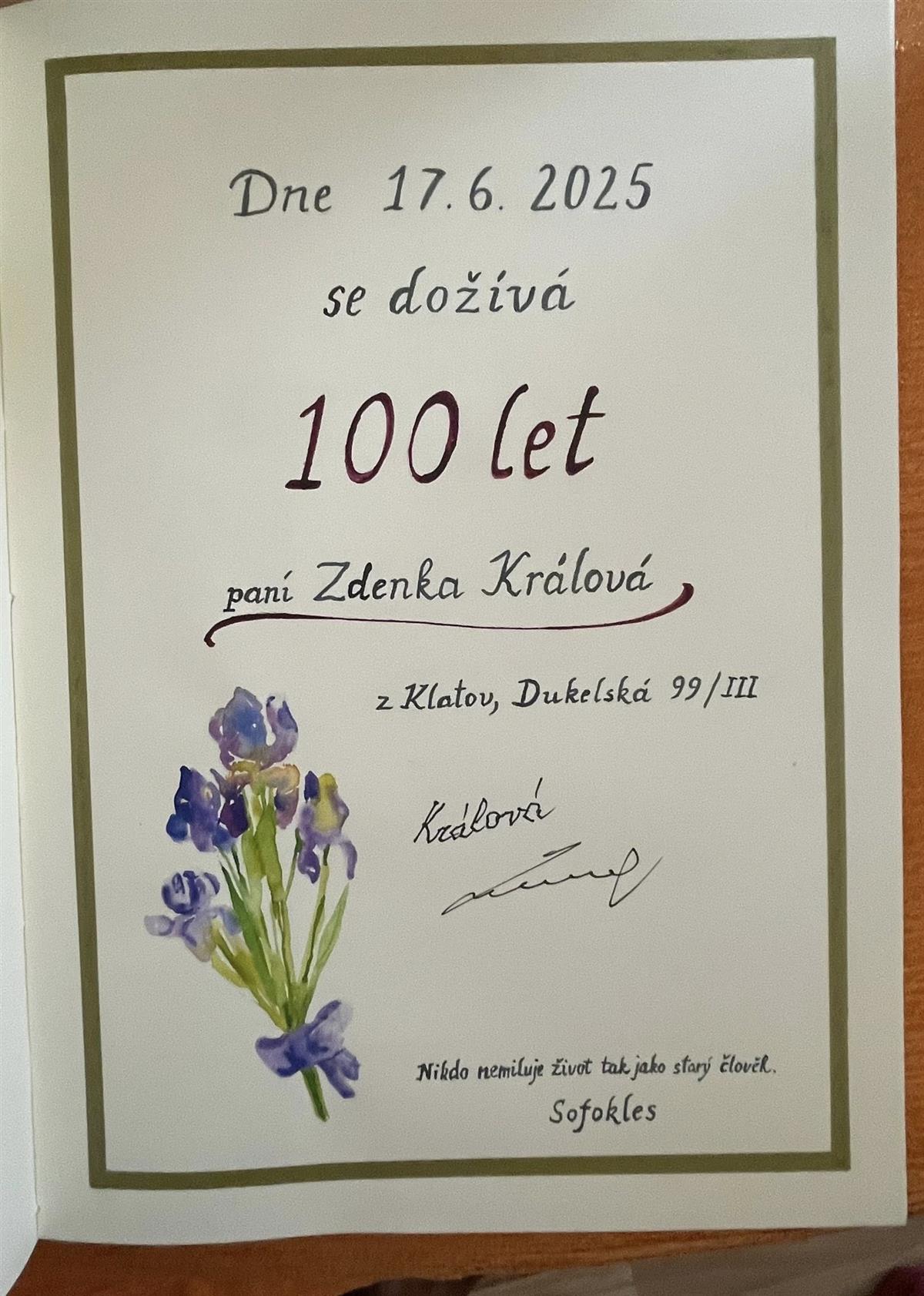 🎉 Paní Zdenka Králová oslavila krásné a výjimečné životní jubileum – neuvěřitelných 100 let! 🎂🌸