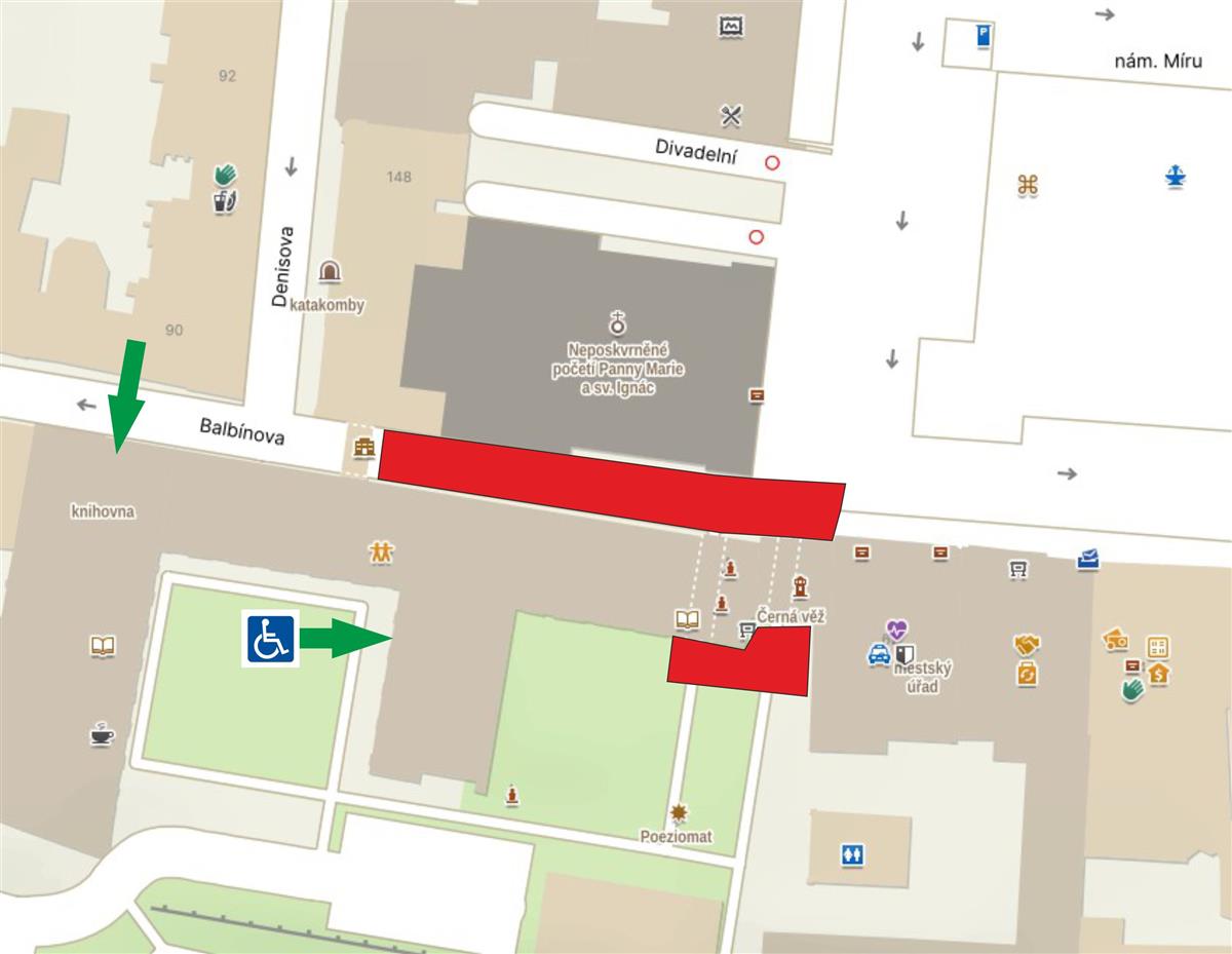 2. 🔁 Ulicí Kpt. Jaroše a Denisovou do Balbínovy ulice, odkud je přístup spodním vstupem ke schodišti u knihovny.
