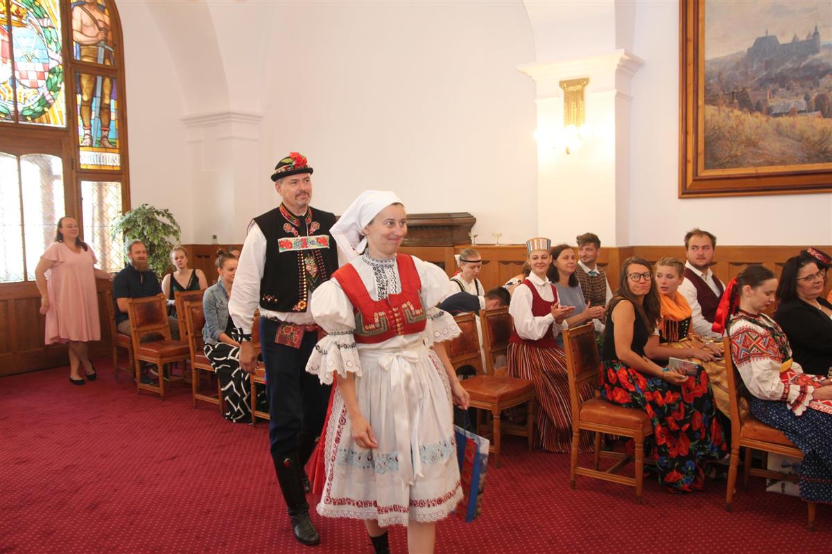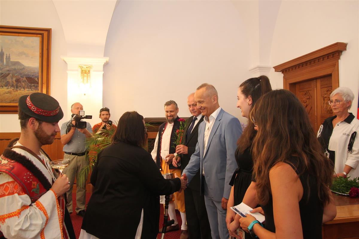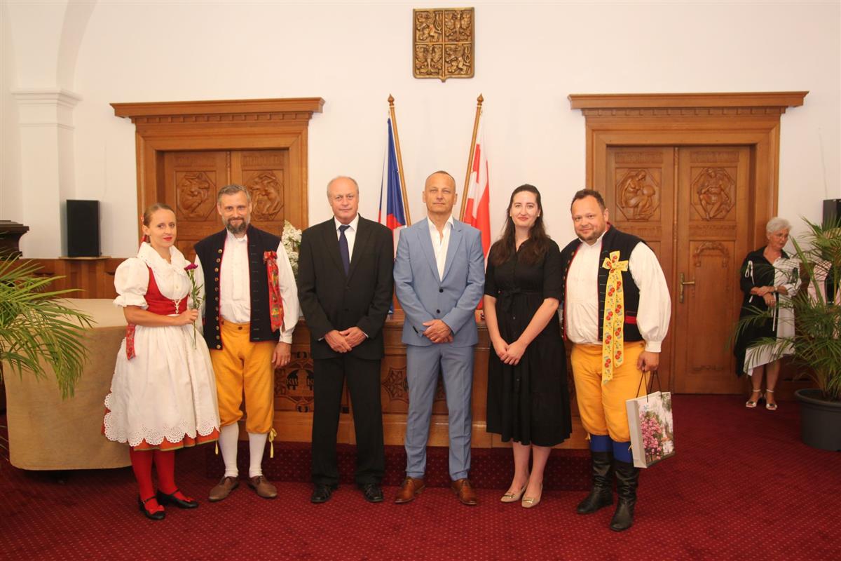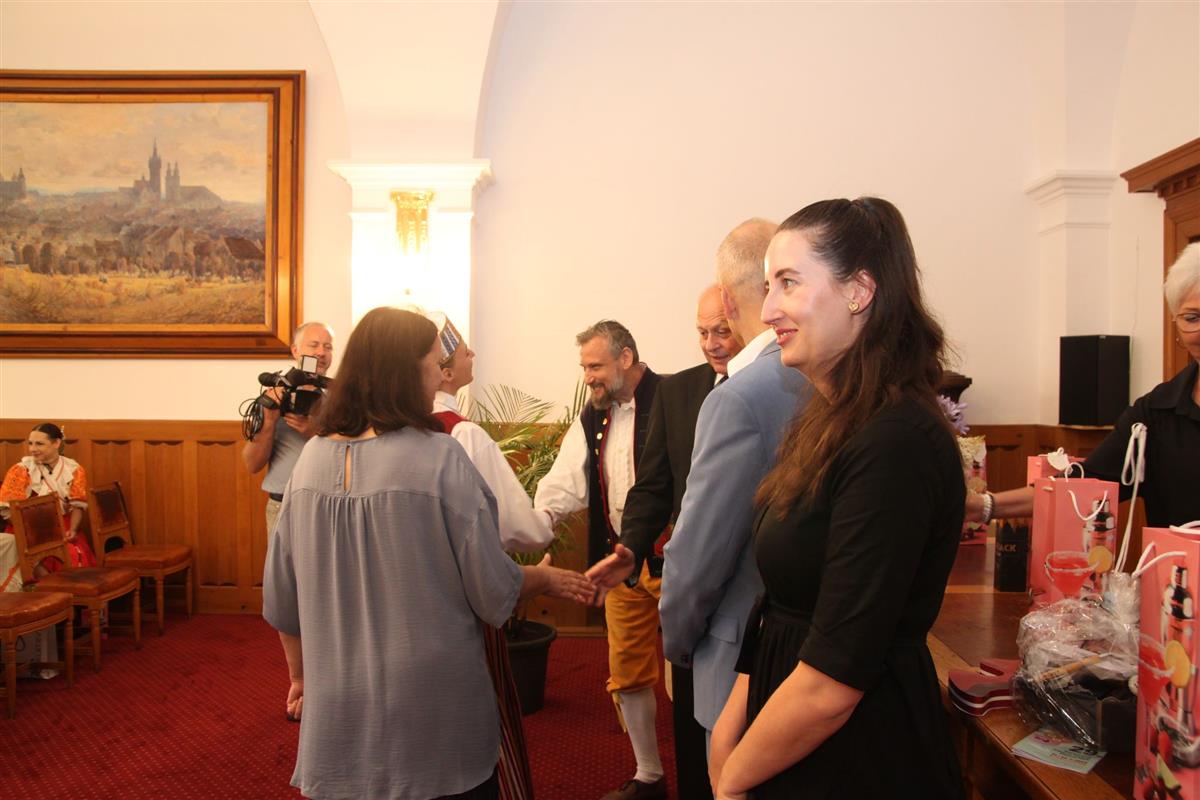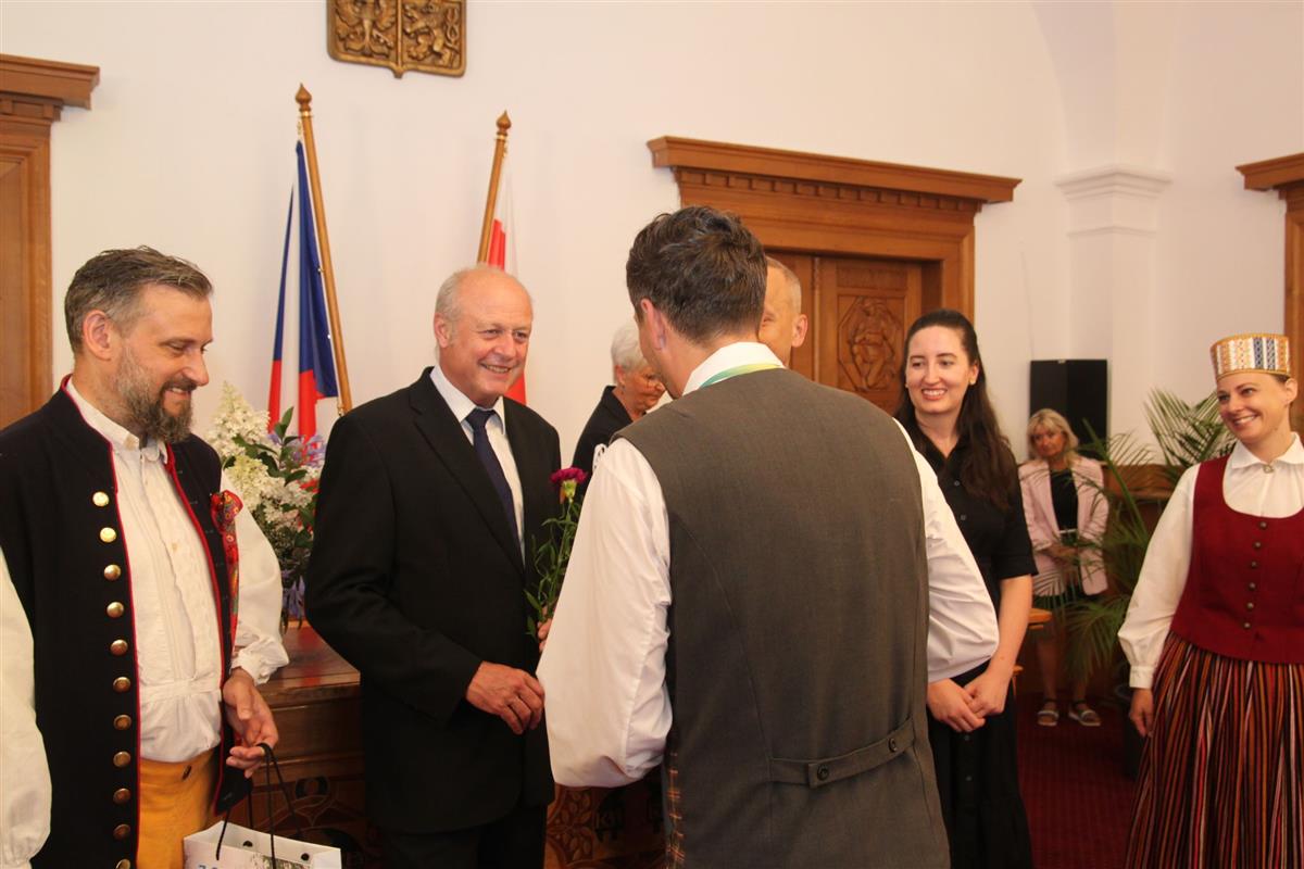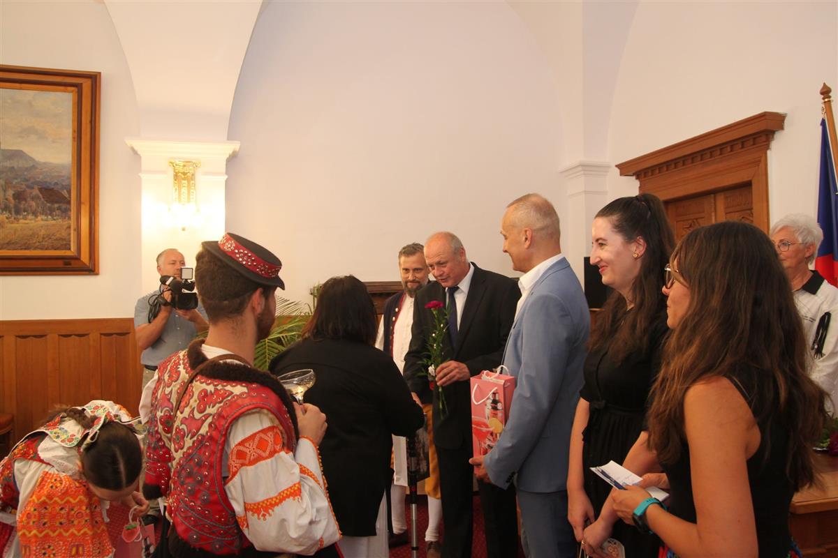 V sobotu 13. července 2024 slavnostně přivítal na klatovské radnici pan starosta Rudolf Salvetr s panem místostarostou Martinem Křížem a tajemníkem Městského úřadu v Klatovech Michaelem Novým zástupce 8 folklórních souborů.