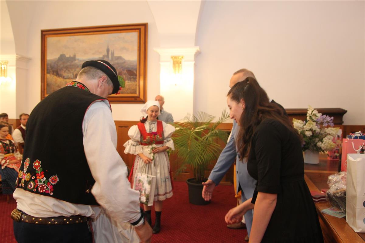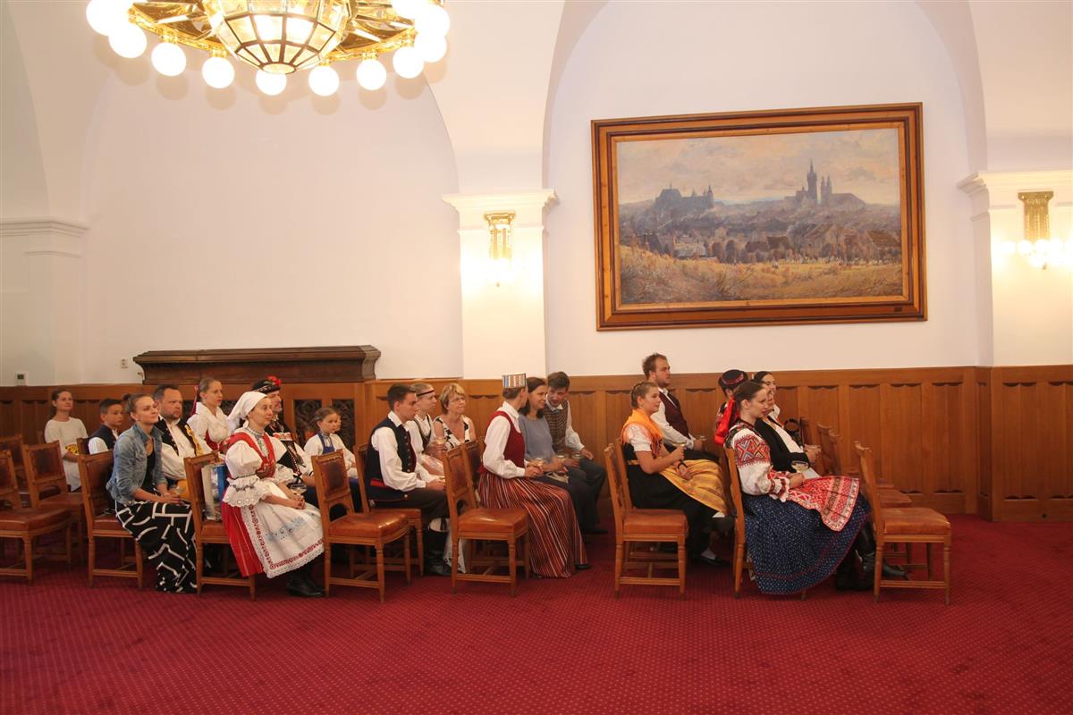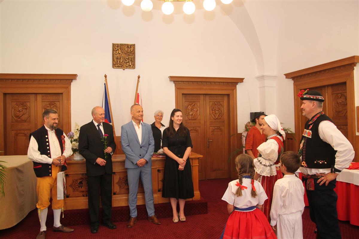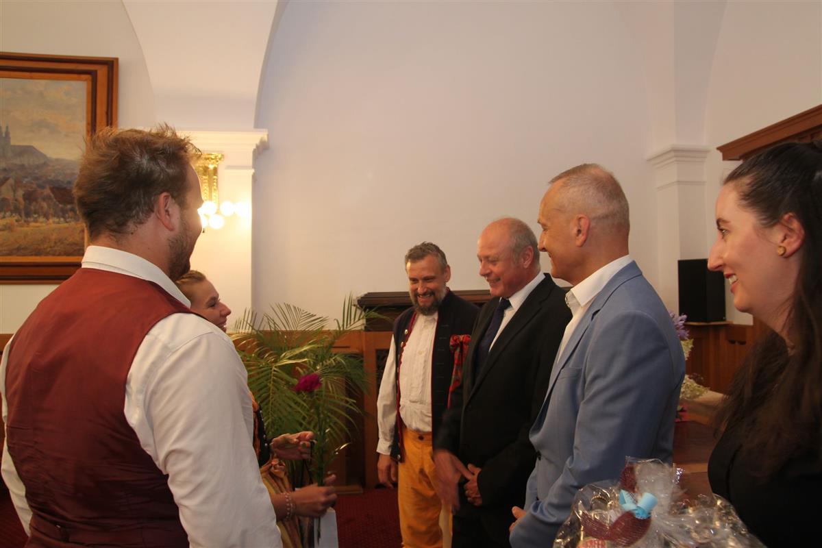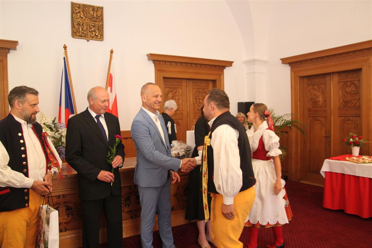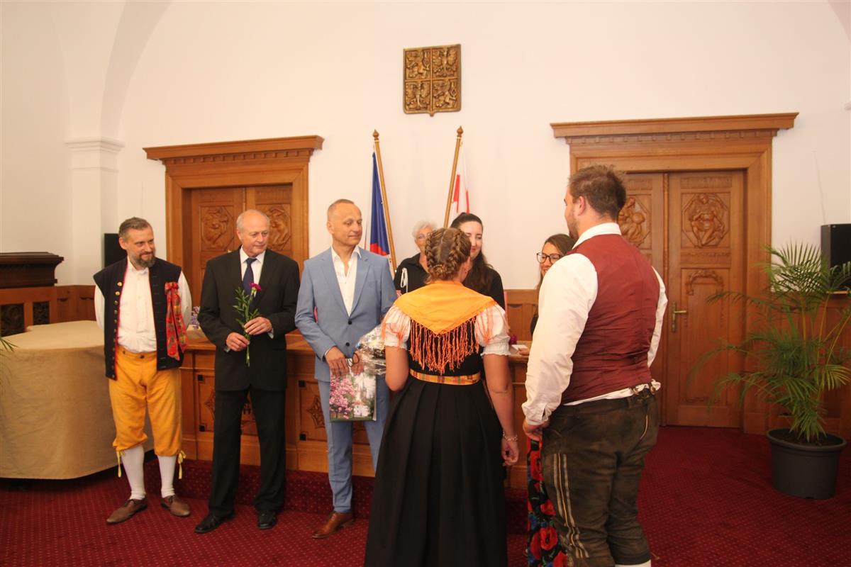 V sobotu 13. července 2024 slavnostně přivítal na klatovské radnici pan starosta Rudolf Salvetr s panem místostarostou Martinem Křížem a tajemníkem Městského úřadu v Klatovech Michaelem Novým zástupce 8 folklórních souborů.