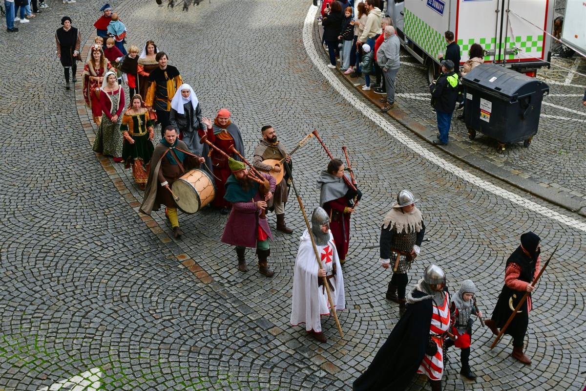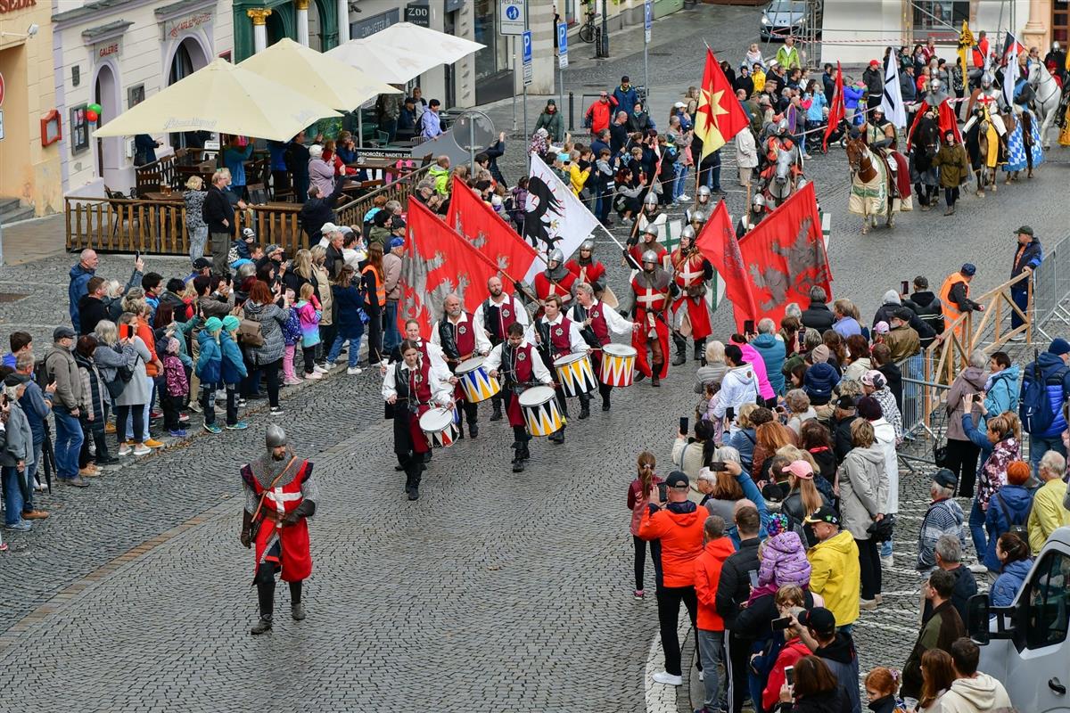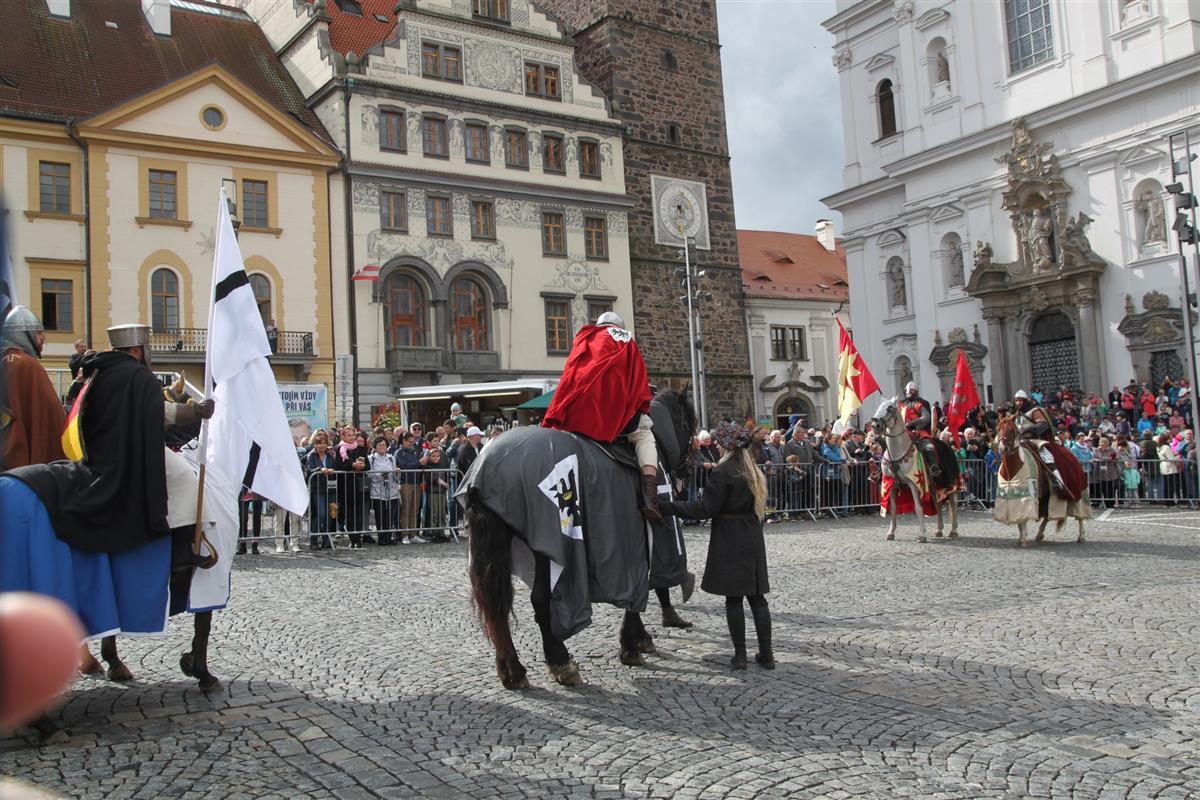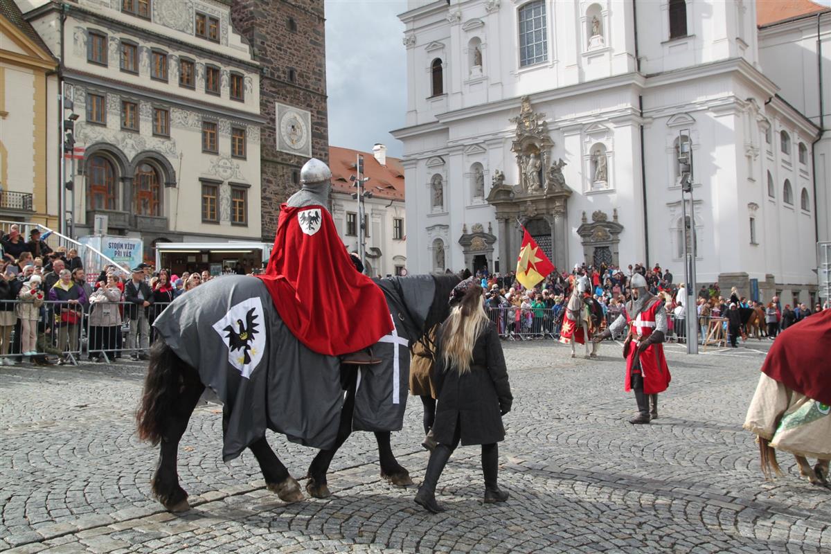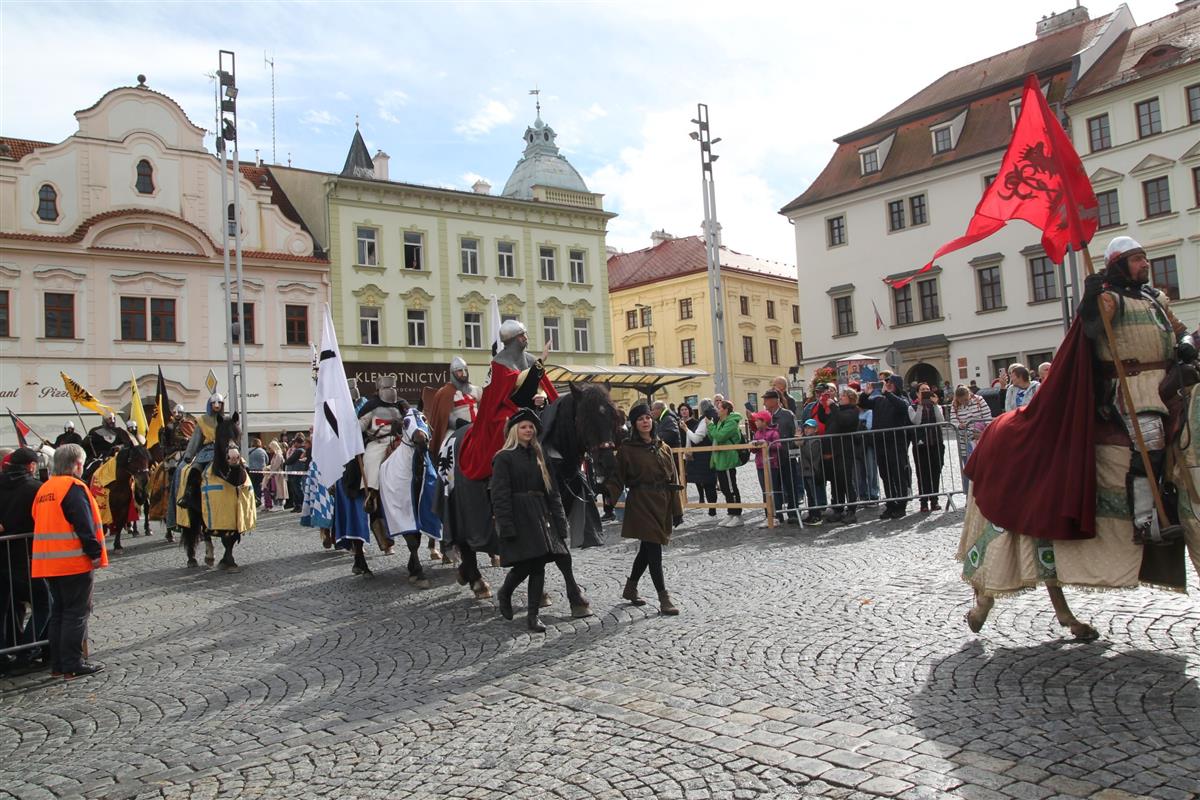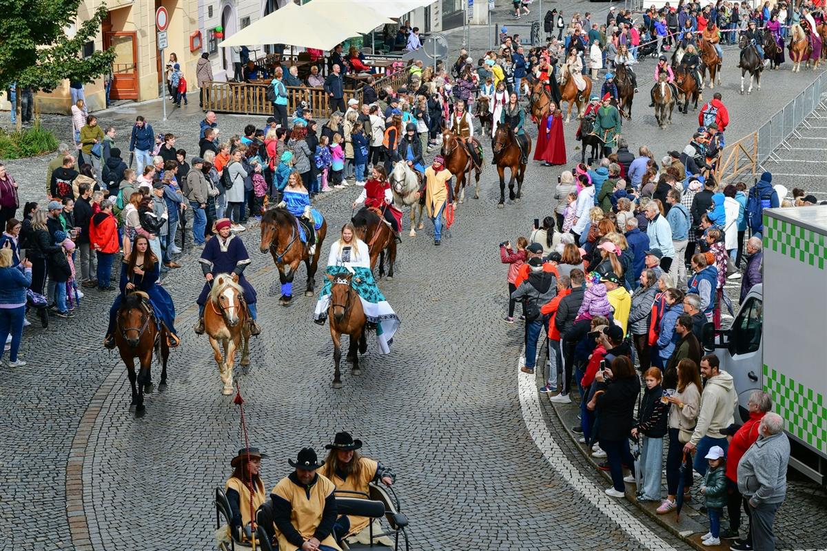 V pravé poledne se na klatovském náměstí shromáždily stovky lidí, aby přivítaly knížete Václava a jeho početnou družinu 🐎