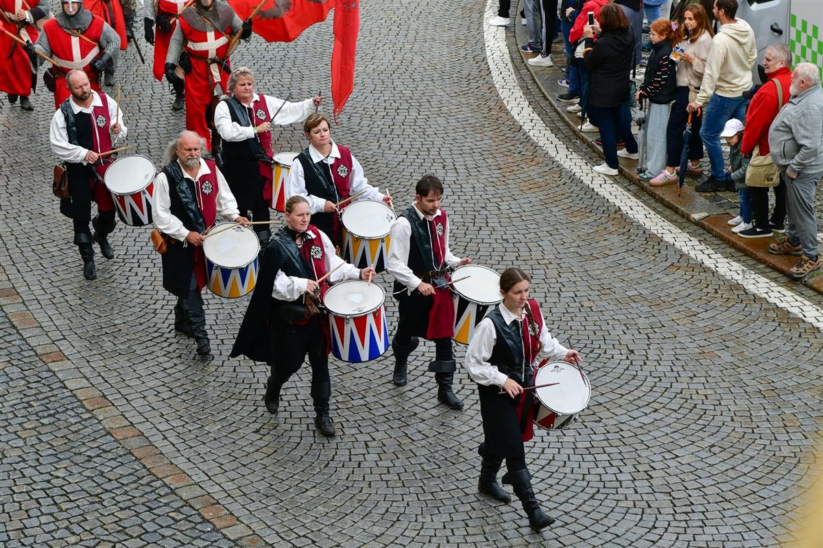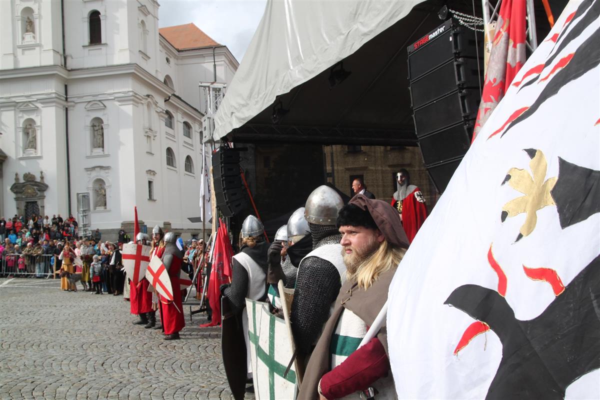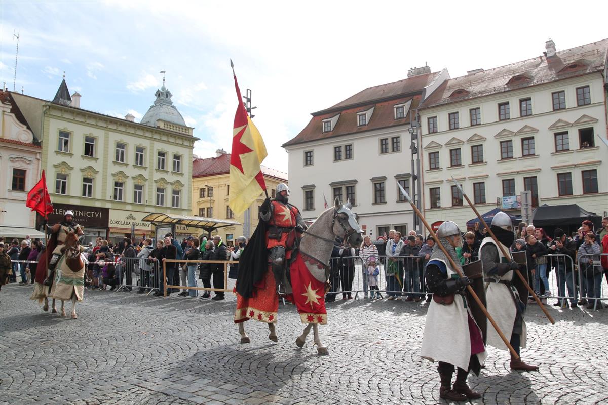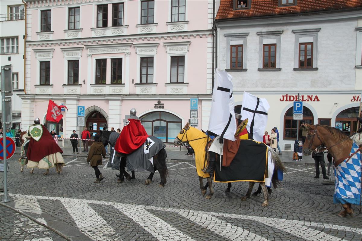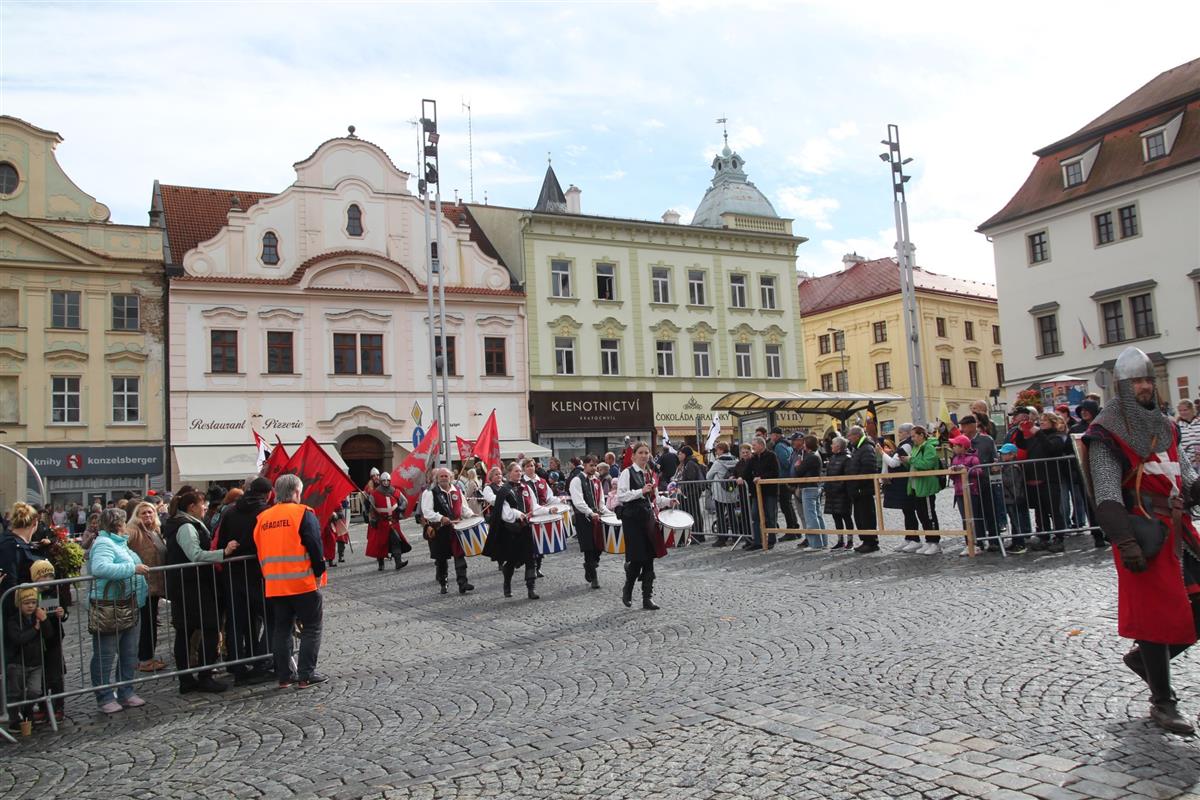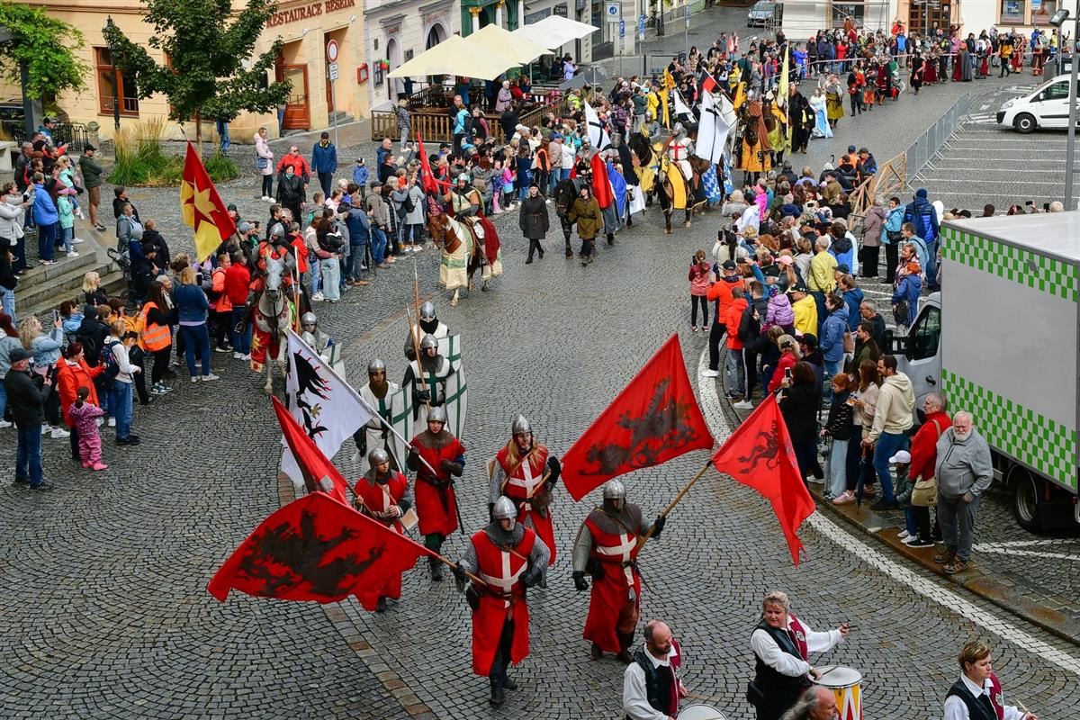 V pravé poledne se na klatovském náměstí shromáždily stovky lidí, aby přivítaly knížete Václava a jeho početnou družinu 🐎